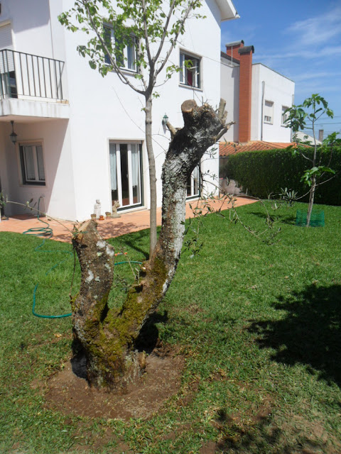 Depois da gloriosa jornada de ontem, hoje de manhã fui acabar de cavar o buraco. Tive que me esquecer dos meus dotes de economista para fazer os cálculos correctos do sítio em que cada parte da raiz iria encaixar, de forma a não haver «caixas de ar». Depois do buraco feito, com uma profundidade máxima de 70cm, chamei as 3 Marias para tentarmos empurrar a oliveira para o buraco. Na primeira tentativa, a oliveira nem mexeu. Parecia cravada à relva e querer continuar deitada. Pensámos chamar matulões mas, antes disso, fizemos uma experiência: para a raiz não prender no terreno, pusemos duas tábuas em baixo de cada lado da raiz... e voltámos a tentar empurrar: