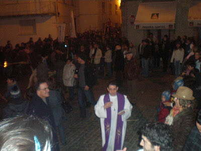 Aqui começa a "procissão" da Santa Bebiana, com o padre(?) a dirigir as operações, perante o olhar incrédulo do Carlos e da Fernanda!